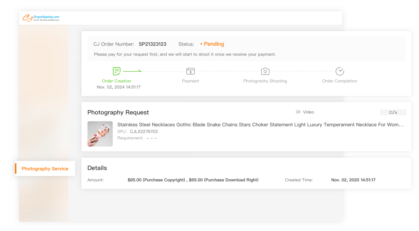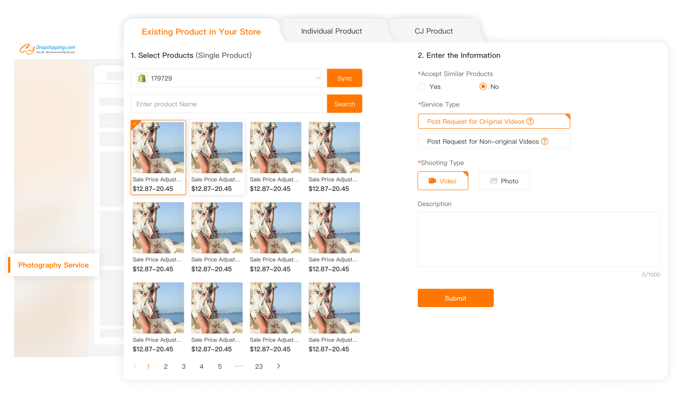 Search for your desired product by name, SKU, or image. Whether it's a CJ product, a store-synced item, or an individual product, simply click Photography Request to apply. Select photo or video, add your shooting preferences, and submit.